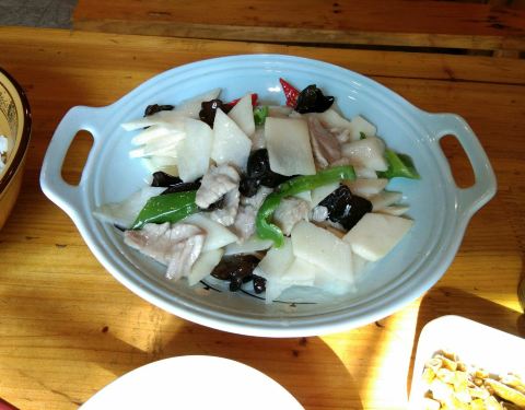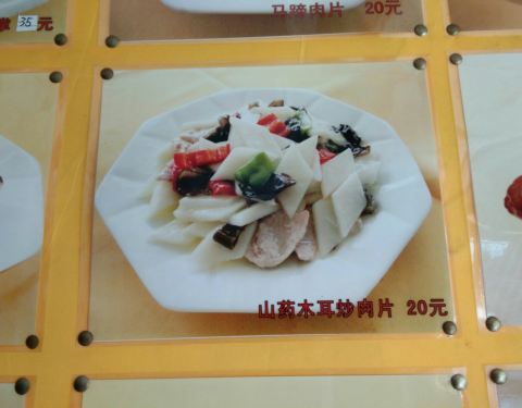 君悦龙轩土菜馆――龙眠山门旁想不到偶遇该店!竟然有两个菜俺爱吃且比城区还便宜!山药木耳炒肉片20元、锦绣素小炒15元,俺一人吃只能二选一。
