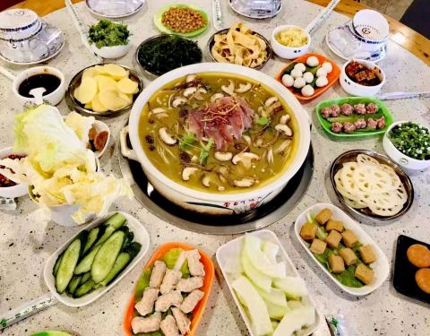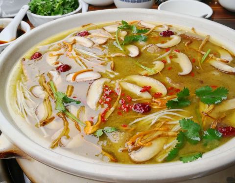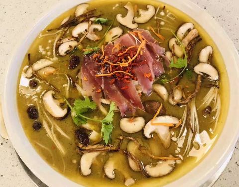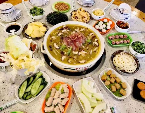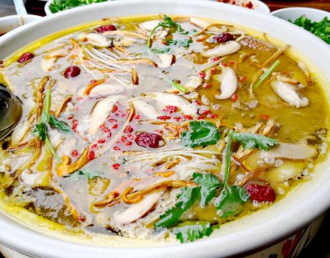 温江区和盛镇一家人气比较旺的特色餐馆,先喝鲜汤再鸡吃肉,然后再涮素菜,餐馆会赠送些配菜。汤里有中药材,鸡肉鲜嫩,滋补养颜,尤其冬季吃起来更舒服。