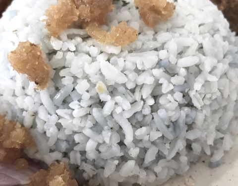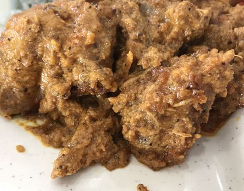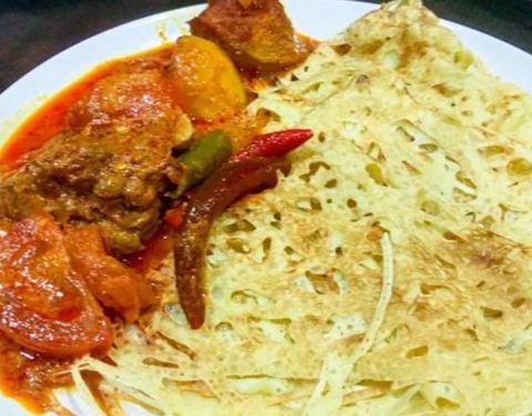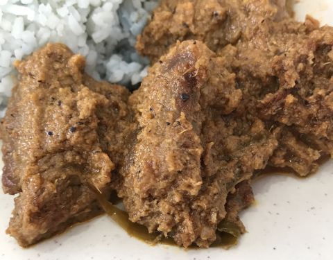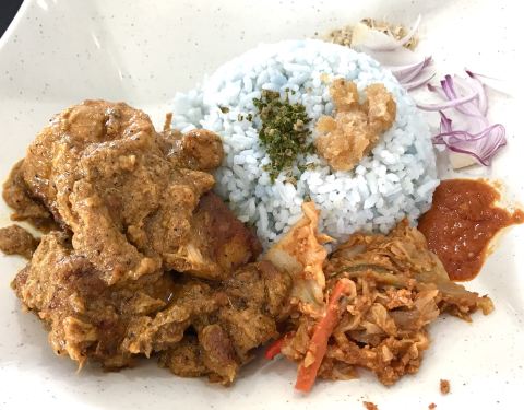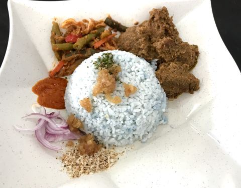 周末早上在马来西亚新山的早餐。马国朋友推荐的接地气娘惹菜,餐厅在一个小镇里,不是很好找。 经过一个多小时的车程,终于找到这家简陋的小店。店里干净整洁,菜单就写在一个白板上,价钱不贵。 孩子们看到蓝色的饭都好奇地点来尝尝,饭没什么味道,仁当好吃 我叫了特色马来煎饼(Roti Jala)和咖喱鸡,另外再点另一道马来鸡丝面。仁当羊肉和仁当鸡肉味道超棒,吃完我还打包几份带走。 甜点煎蕊是这里的招牌菜,还有在周末才卖的娘惹糕点也是很抢手。好多当地人会来打包。