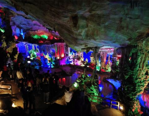 围绕酒店区域有几个溶洞,参观时彩灯璀璨,不过洞内已几乎不再发育,虽然阴凉,可是并不潮湿