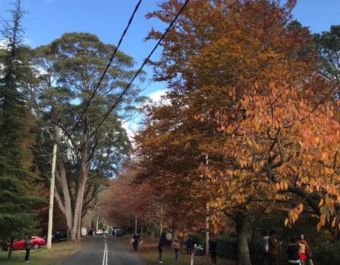 蓝山很大 这是蓝山植物公园 解禁后的第一个周末人非常非常多。现在是澳洲的秋天,无疑 蓝山的秋天是很美的。这里有枫叶有梧桐树,各种各样的色彩层层叠加。这里的气候也要比悉尼市区冷一点。落叶加上五彩缤纷的色彩,蔚蓝的天空乍是好看。
