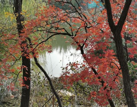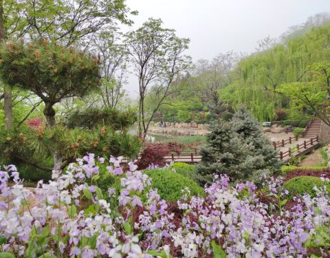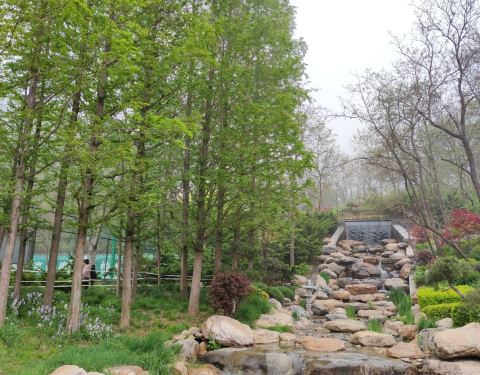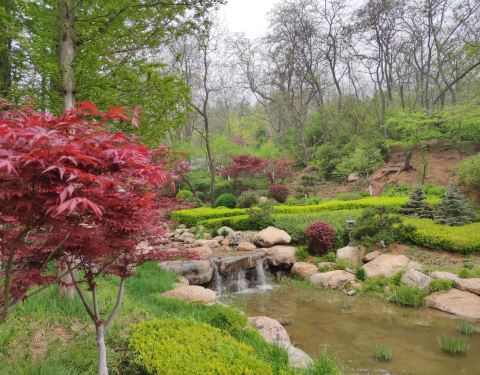园内四季被各色植物覆盖,春季迎春花和丁香花香飘满园,夏季槐花领衔的百花怒放园中,秋季满园都是由嫩黄银杏和鲜红枫叶交织的色调,冬季各类松柏依然翠绿傲立园中。园东部有潭池水,面积达7000多平方米名曰:“...