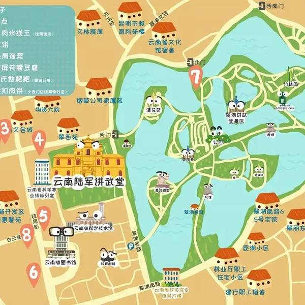 再过一个礼拜蓝花楹就要开了,国内蓝花楹最美的地方除了之前写过的西昌,就是昆明了。 虽然昆明的蓝花楹在规模上不如西昌,但她有交通枢纽的优势啊,如果你觉得去趟西昌太麻烦,昆明就是最优解。 虽然在绝大多数情况下,她只是去云南下面地级市的中转站,但来昆明的次数越多,我就越能感受到她的魅力。 换个思路,昆明未尝不是一个全能型的旅行目的地。 昆明有审美一流的花市、市场,有好逛不输大理的集市,花10块钱就能钻进凹糟馆子美美吃一顿,找来的零钱买包鸟食,能在滇池喂一下午海鸥…… 她的确没什么惊艳的景点,也没有泼水节这样的盛会,昆明擅长的向来是“低成本的快乐”。 我记得大理“人间乌托邦”的风刮得最猛的那几年,隔段时间就能看到卖房去大理开民宿的故事。也不必非得去大理,老昆明人过起日子来,也是“张弛有度”的。 结束上份工作我给自己放了个假,走完洛克大环线本想从昆明回杭州,结果续续续续住了有小半个月,每天忙着吃茶、烤太阳、冲壳子(聊天),就差把“舒坦”两个字写在额头上了。 对四季如春的昆明来说,一年只分两个时间:“适合旅游的时间”和“特别适合旅游的时间”。 那我要说了,蓝花楹的花季就是昆明特别适合旅游的时间。 希望4月疫情缓解,可以打个飞的去春城续费春天~ 1.春天的昆明是最适合散步的城市 如果你赶上了蓝花楹花季来到昆明,教场中路、红锦路、春城路这三条路是肯定要去逛逛的。如果你选择在非花季来,我也想推荐一条常规版的昆明Citywalk路线。 在昆明求学生活了七年的汪曾祺说,翠湖是昆明的眼睛。 这条Citywalk路线就围绕着本地人最喜欢逛的翠湖展开,大致可以看成是条“翠湖环线”,起点可以定在昆明老街。 最早的昆明老城,就是五华山市政府为中心,青年路、小西门、南屏街、北门街围起来的这一点区域。 从光华街为中心,往四面发散的钱王街、文明街、文庙直街、景星街、甬道街,被统一规划成了“昆明老街”的街区,这也是昆明城中最后遗留的历史街区了。 现在昆明最热闹的商业街,就在市政府直通的这条正义路上,垂直于正义路的老街,就是光华街。 光华街没那么时髦,以老建筑为主,百年药店福林堂、米线老字号建新园都在这条街上。 这一片最出名的打卡点就是老昆明口中的“酒杯楼”,它正式的名字应该叫金杯楼,因为建筑外观很稀奇,专门来拍照的人也特别多。 在文明路上还有一家东方书店也很有来头,最早是1926年开的,在“西南联大时期”是很多学子买书的地方,像林徽因、闻一多、汪曾祺就都是常客。 现在的书店是2018年重建的,还是非常复古。 光华路沿市府东路走,过了路口就是昆明最老的景星花鸟市场,著名作曲家聂耳的故居,就藏在花花草草之中。 如果你是周末来玩,这里还会变成一个“快闪”老街跳蚤市场,杂货、古董古玩以及书画作品都有,市场一直从上午摆到下午,天气好的时候尤其热闹。 花鸟市场的正对面,是昆明现在地标之一的胜利堂,当初是为了抗战胜利建的,和酒杯楼是一个设计师,把它们放在一起看才是完整的一套设计。 离开胜利堂,能走到昆明文庙。 这座文庙有300多年历史,因为一些历史原因,被损坏得非常严重,现在能看到的大部分建筑都是后来恢复的。 它文庙的原始功能基本没有了,现在是昆明文化馆、昆明市群众艺术馆,老人们平时很喜欢来乘凉聚会。 出文庙,再步行大概10分钟,就到昆明人最爱的翠湖公园了。 翠湖公园很像成都的人民公园。
