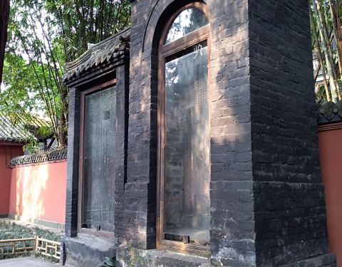 三绝碑:本名蜀丞相诸葛武侯祠堂碑。在武侯祠大门至二门之间的东侧碑亭中。碑高367厘米,宽95厘米,厚25厘米、唐宪宗元和四年(809年)刻建。由唐代宰相裴度撰文,书法家柳公绰(柳公权之兄)书写,石工鲁建镌刻。裴文、柳书、鲁刻,三者俱佳,所以后世誉为三绝碑。碑阳、碑阴、碑侧遍刻唐、宋、明、清时代的题诗、题名、跋语