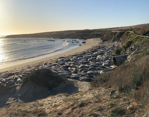这个景点建议一定要停下来,看一看。 真的很有趣,海滩上齐刷刷的躺满了胖乎乎的海豹,其实我也不知道是海豹还是海狮。 反正就是那种憨憨的没有腿的,蠕动着走的海洋生物。 它们都很悠闲的躺在海边的砂糖上,密密麻麻的,我这种密集恐惧症,真的看着有些不是太舒服。 况且它们真的很臭啊,刚一下车我就闻到了一股恶臭,像是那种从来没有打扫过的的公共厕所的味道,特别恶心。 但是呢,当你看着它们这些没有腿的生物,匍匐前进,或者懒得等海水将它们冲上岸的那种情景,还是会不由自主的想笑。 我就在那儿一个人笑了好久好久,真的是莫名戳中我的笑点了。 很多蚊子在他们身上飞过来飞过去,爬得它们满身都是,但是它们并不在意,一直昏睡。 而,对面的那个小岛上也是很多海狮,,感觉都快给小岛压沉了! 哈哈哈,我想用“死猪”来形容它们,不是别的意思,单纯觉得它们太懒太可爱了,随便你干什么,它们都不为所动。 还有就是,为什么它们喜欢在这里栖息呢?并且为什么这里会有这么多这个动物呢。