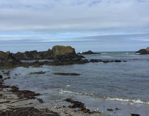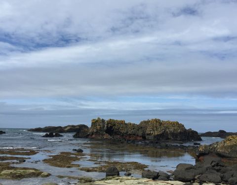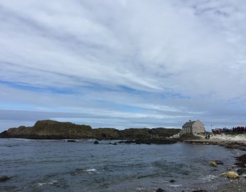 然而若不是我们兴致大好,跟着当地人一块攀上山坡,一定会错觉这里是个“岁月静好”的地方。当我们手脚并用的爬上这座小土坡,眼前望见的是巨浪滚滚的大西洋,海浪拍打在礁石上的力量太过巨大,直接把海水冲击成了海泡沫。我努力拉紧衣服以防被从耳畔呼啸穿过的海风吹倒,但事实证明这是徒劳的。刚下过雨的天空依然带着水汽,迷蒙的金色阳光与湛蓝的海水,以及石头砌成的Cottage和堤坝,完全是一片世外桃源的宁静。当地人带着孩子来这里徒步、垂钓,也有牵着爱犬来海滩慢跑的。