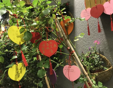 夫子庙步行街上有一个网红店——思贤庄。店铺虽然不大,但游人如织,真是酒香不怕巷子深。走进去就会发现别有洞天,到处悬挂着人们的心愿卡,五颜六色的,好不喜庆。好多游人在拍照留念。