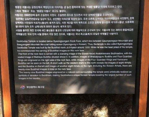 Seobulsa很小,但是与釜山其他寺庙都不一样,因为在寺庙后面有巨大的石刻。确实值得来打卡。你可以通过许多种交通工具来,如果你想把一些景点结合起来你可以从要塞徒步过来还能增加点运动量。我和几个朋友参观了Seokbulsa寺庙,给我们留下了深深的印象。我们把车停在了山下大约1公里的地方,对面有一个小咖啡馆,非常的好,老板给我们提供了很棒的服务。爬到寺庙处,需要一些心肺运动!一旦走进寺庙的大门,呼吸到山中清新的空气,我感觉十分放松。这里非常的安静祥和。石雕也很值得一看,工艺熟练且细致。这是非常棒的体验。