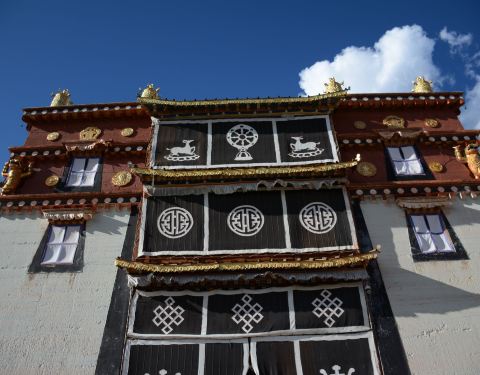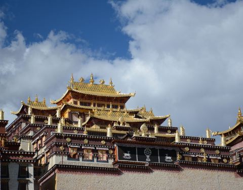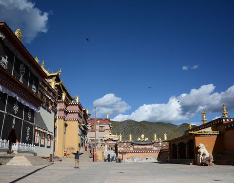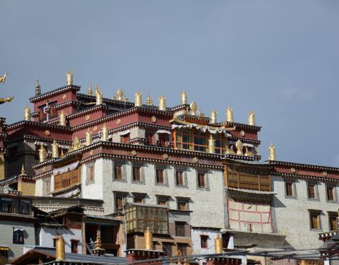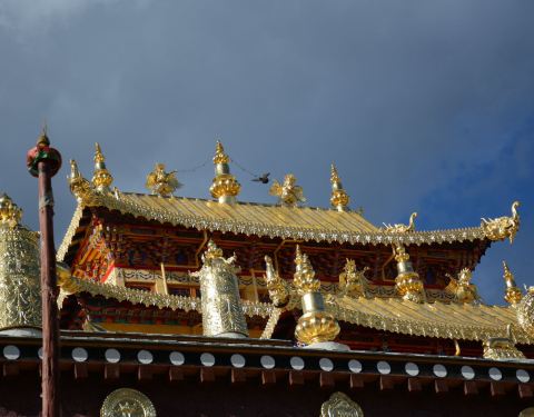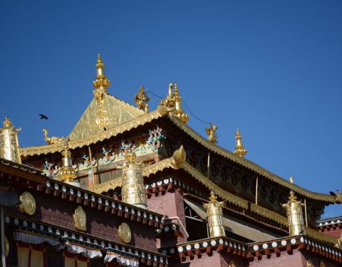 噶丹松赞林寺的藏宝展览馆在松赞林寺里面,非常喜欢这个景区。一口气爬到松赞林寺的最高处,可以欣赏拉姆央措湖面的风光,金色熠熠的转金轮映着蓝色的天空和朵朵的白云格外显眼夺目,这种异域风情我是第一次见到,内心非常震撼。旅行的意义在于人生的不同的体验,不停地感受文化的冲击带来的新的感官的体验和内心的震动,感受人与人之间的志同道合和互相磨合的过程。