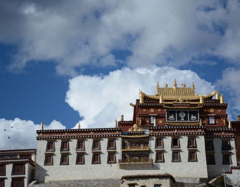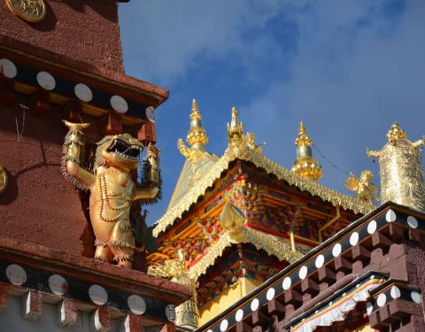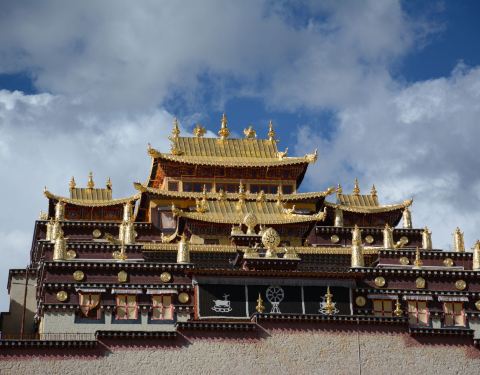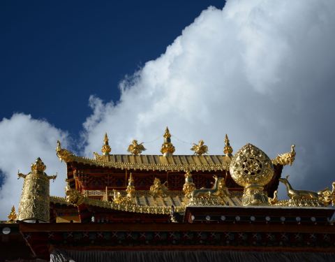 噶丹松赞林寺的藏宝展览馆在松赞林寺里面,非常喜欢这个景区。一口气爬到松赞林寺的最高处,可以欣赏拉姆央措湖面的风光,金色熠熠的转金轮映着蓝色的天空和朵朵的白云格外显眼夺目,这种异域风情我是第一次见到...