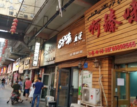 苏杭吧水文化美食城在阿克苏兴隆街那儿,位置比较好,夹在阿克苏体育馆和友好百货中间,里面有不少美食,也有卖鸡的,基本上内地有的,这儿都有。