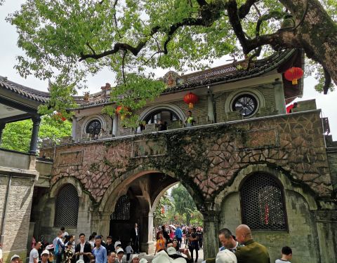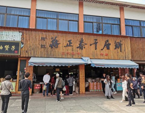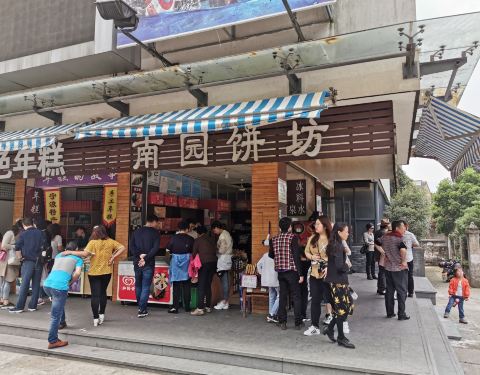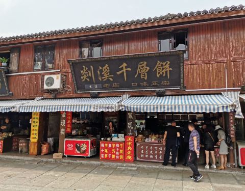 武岭西路商业步行街,东西向贯通“蒋氏故居景区”,步行街南临剡溪,北侧依次分布蒋氏故居各个建筑及众多商铺,商铺建筑仿明清风格,古色古香,以售卖现场制作的溪口特色小吃~“千层饼”为多。 从剡溪对岸回望步行街,蓝天白云下,步行街背靠雪窦山,静静的剡溪从前流过,繁华的街景,熙熙攘攘的人流,胜似一幅“清明上河图”画卷。