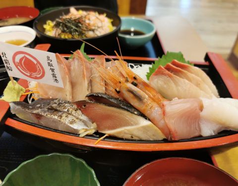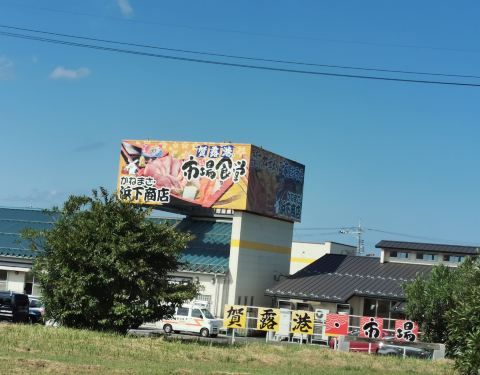 賀露鱼港是鸟取县知名的鱼港之一,而且这里离鸟取砂丘特别的近,开车过来十几分钟就能到,鱼市有一个超级大的招牌。不过虽然说是鱼市,其实面积比我们想象中的还是小了一点,每一家店都比较小,而且人也不是很多。虽然看到不少松叶蟹,但是现在不是最佳时节,鱿鱼倒是不错,尤其是放在门口吹干的样子超级好玩,特地拍一段视频。 市场里唯一的亮点是鱼港食堂,可以吃到比较新鲜的当地鱼刺身,强烈推荐北前船定食。