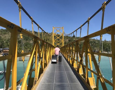 黄桥在蓝梦岛上,只是为了拍照。地接跟我们说也不明白这为什么是个景点,只是为了拍照,大家都来。哈哈哈哈。其实这里有点危险,因为桥很窄,上面有来回两个方向的摩托车自行车,一定要注意安全。蛮特别的黄侨是小铁桥,尽量等对方机车骑完再骑过去,因为很小一条而已,而且骑上去都是铁板的声音,有点特别~ 从这边骑过去,就可以到另外一个小岛囉!
