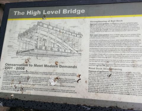 在泰恩河上不到一英里有六座桥,建于不同年代,满足时代需求。这座桥是上下两用,上层火车,下层汽车,可以跑双层公交车。有许多海鸟在这里,所以不时会有天粪掉下来,就连桥头的广告牌也有很多。从桥上可以看到两侧的其他几座桥,其中一侧为swing bridge、Tyne bridge和millennium bridge。