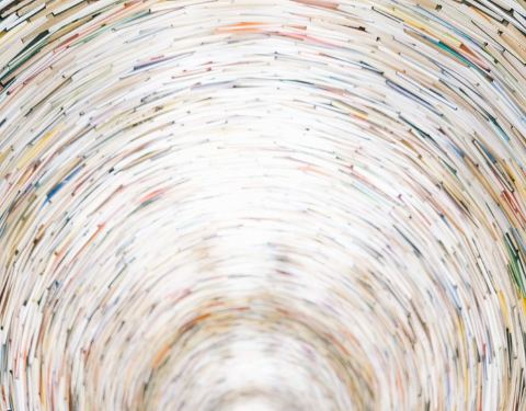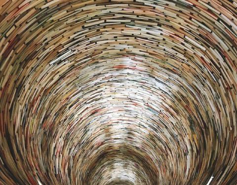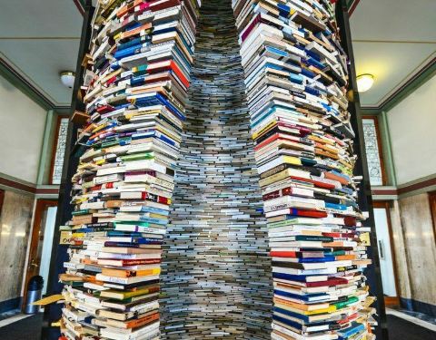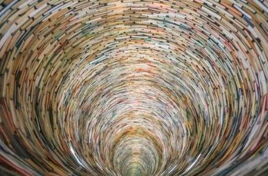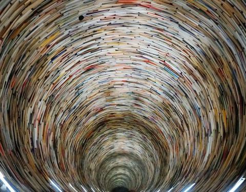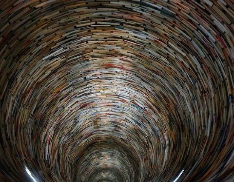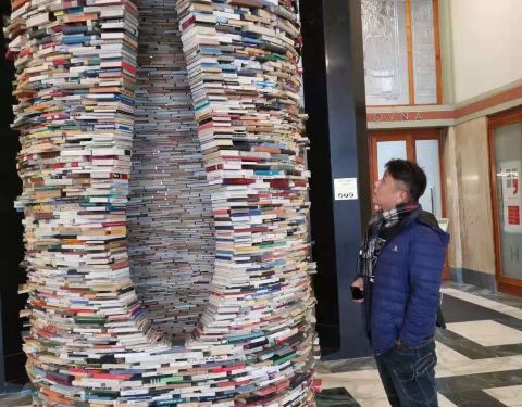 这又是一个网红图书馆很多人过来拍照,里面有一个用图书搭成的旋转台样式的造型,其实它底部是有一面大镜子的,所以从视觉上来看非常像一个螺旋形的旋涡。