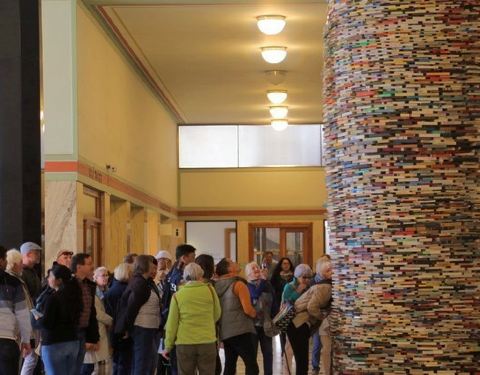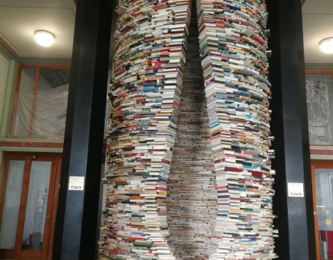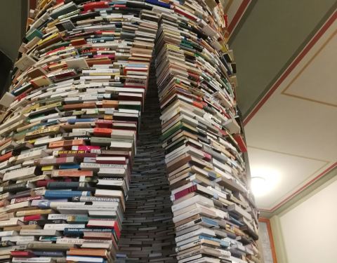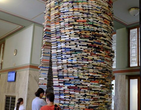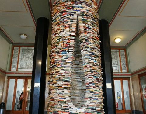 图书馆位于城市的中心,建筑是一个非常古典的建筑,方方正正的。图书馆里面最吸引人的是一个很大的用书籍摆成的螺旋形的造型,搭配上镜子,呈现出一种非常玄幻的感觉。