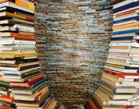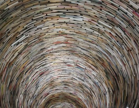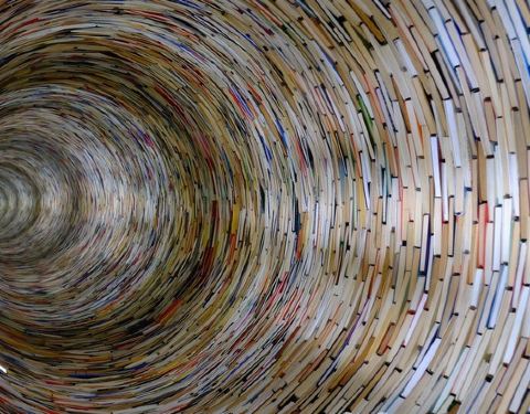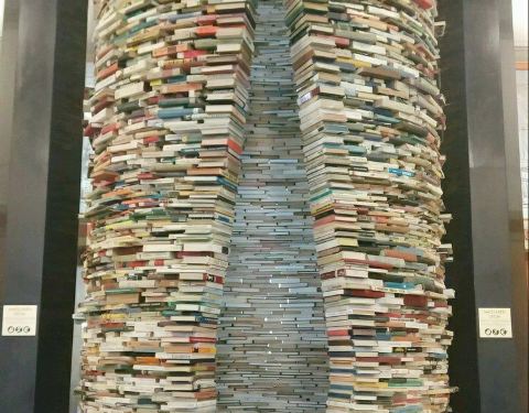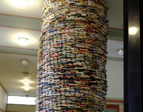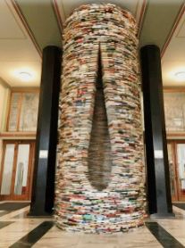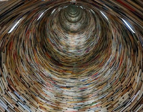 ...图书搭成的旋转台样式的造型,其实它底部是有一面大镜子的,所以从视觉上来看非常像一个螺旋形的旋涡