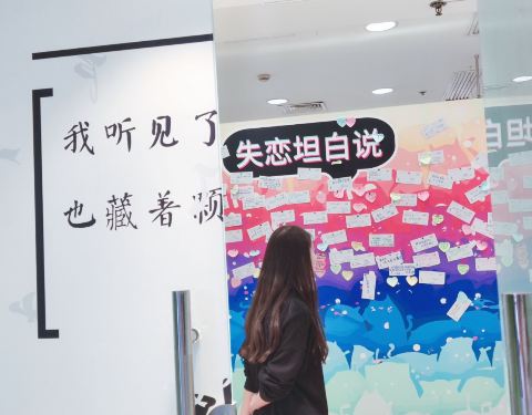 店在解放碑日月光中,老远看到墙上的标语,超级吸引人。门口写了好多古今中外关于爱情的诗歌,淡淡的悲伤。 门口还挂了一些给恋人的信,有几封还是很感人的。 进去要买票,感觉人不多。大多是年轻人分享伤感,追忆过去的地方。