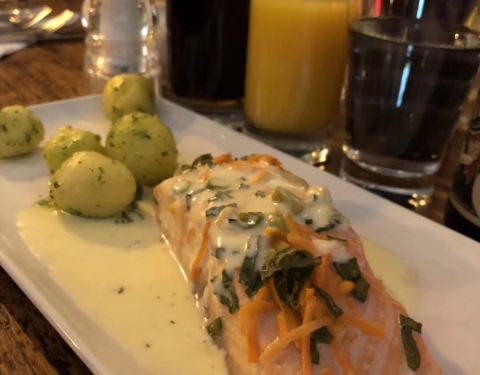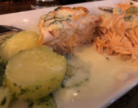 当我第二次来到这家餐厅的时候,我发现服务要比之前来的要好一点,起码服务员对我露出了笑脸,环境还是依旧的那么舒适,食物也还和以前差不多,但是增加了一些本季节专属的一些食物。烤鱼超级的棒,虽然外面一层...当我第二次来到这家餐厅的时候,我发现服务要比之前来的要好一点,起码服务员对我露出了笑脸,环境还是依旧的那么舒适,食物也还和以前差不多,但是增加了一些本季节专属的一些食物。烤鱼超级的棒,虽然外面一层鱼皮看上去黑黑的,皱皱的,但是里面的鱼肉很细嫩而且还很多汁。因为鱼之前是腌制过的,所以味道非常的好。 - ...一层有点硬,但是一口咬下去,口感超级的棒,要是觉得油腻,可以吃点酸黄瓜,脆脆酸酸的,口感棒棒哒