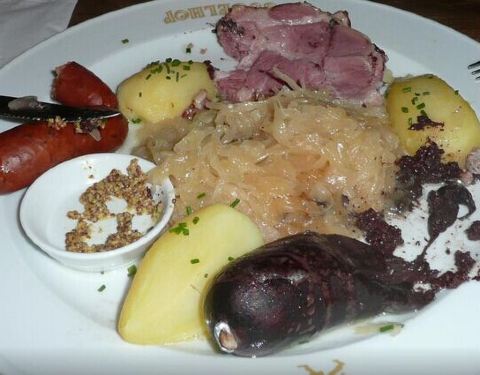 两排大树的中央摆放的是木质桌椅,阳光不会射到餐桌上面,认为在外面就餐感觉味道的好,而且氛围非常的热闹,桌椅都非常的干净,就连地面也很干净,我还是挺喜欢这个外部就餐的地方的。我点了一份香肠和一个酸黄...两排大树的中央摆放的是木质桌椅,阳光不会射到餐桌上面,认为在外面就餐感觉味道的好,而且氛围非常的热闹,桌椅都非常的干净,就连地面也很干净,我还是挺喜欢这个外部就餐的地方的。我点了一份香肠和一个酸黄瓜,香肠外面一层有点硬,但是一口咬下去,口感超级的棒,要是觉得油腻,可以吃点酸黄瓜,脆脆酸酸的,口感棒棒哒。 - Great food. Not cheap but worth the price. Stuf...