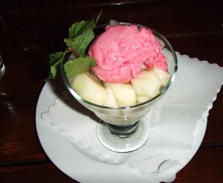 到达餐厅时候已经很晚了,室外的位置感觉灯光有点差,我们就坐在了室内,推荐他们家的鱼、奶酪和火锅,这些算的说是他们家的招牌菜了,但是我和朋友今晚并没有点这些,因为我们已经吃过还几次了。(*^__^*) 嘻嘻…...到达餐厅时候已经很晚了,室外的位置感觉灯光有点差,我们就坐在了室内,推荐他们家的鱼、奶酪和火锅,这些算的说是他们家的招牌菜了,但是我和朋友今晚并没有点这些,因为我们已经吃过还几次了。(*^__^*) 嘻嘻…… 这次我们点的是粉丝、土豆、肉片等搭配的一个套餐,味道非常的好,食材也很新鲜,唯一不好的就是我不确定它叫什么名字。饭后甜点是苹果上面加的草莓奶酪,外观设计非常的有创意并且也不会觉得很甜腻,饭后吃点水果,更加的容易消化食物。 餐厅装饰很符合当地的装饰特点,服务工作人员也很训练有素并且还非常的热情,微笑让我觉得很真实,没有丝毫的职业性微笑。