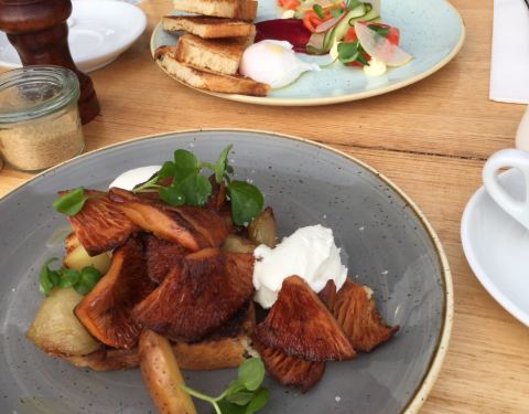 Smoked trout (top) and daily special of BBQ mushrooms with potatoes and goats curd.
