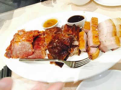 - 我们要求他们的组合烧烤拼盘、烤猪肉、烧鸭、叉烧、铁板牛肉、排骨、鸡腰果、白豆腐和甜点都是很美味的