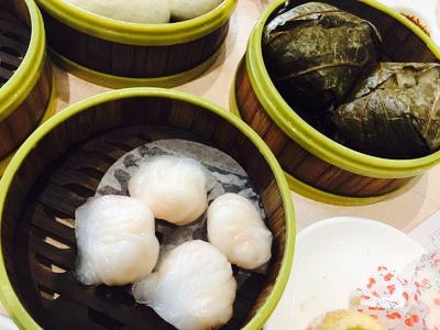 鲜虾、饺子、小笼包、炸豆腐、鸡脚、烤鸭、炸大虾、炸鱿鱼、芝麻球、点心料理,你必须尝试一下每样东西