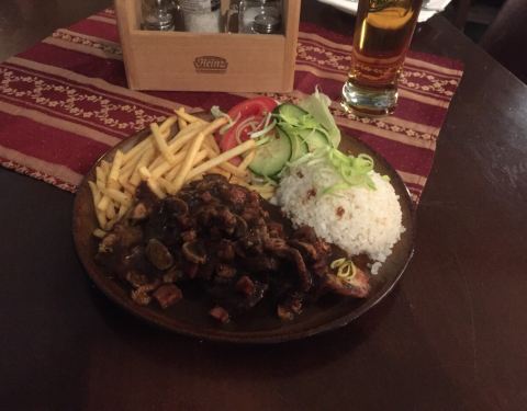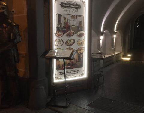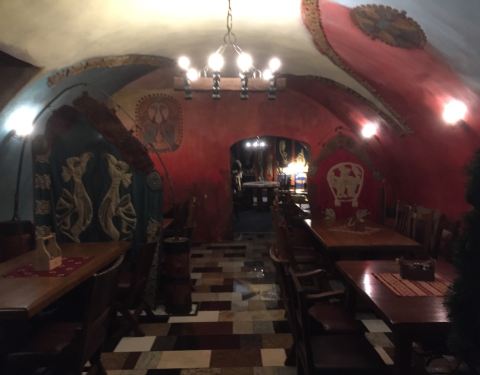 餐厅位于迈克尔城门附近,经过时看到他们的广告才跑进小巷内才找到。里面的装修古色古香,墙上挂了不少摆设,很有中世纪欧洲的风味。吃的都是斯洛伐克菜式,点的猪排和牛排有点咸,不过还是全部吃掉。