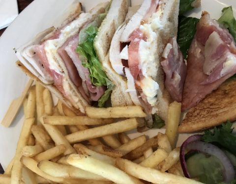 鸡肉烤得非常干,黑色的地方还有点苦,club sandwich,面包干干的,因为英式培根是比较...