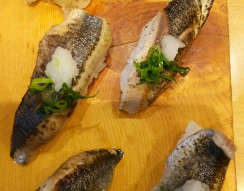 炙り秋刀魚の寿司。醤油を4滴たらして香ばしく旨い