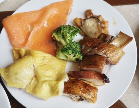很久之前来过,对香荟还不是很感冒,但最近来的一次确实改观不少啊,可以说是非常满意了。 提前预约了窗边的位置,视野还是挺不错的。遇上生蚝美食节更是幸运。【新西兰莫纳生蚝】【法国罗曼第黄金生蚝】【吉纳多生蚝】【马德拉生蚝】四种不同的现开生蚝随便吃。自助餐小王子吃了十多只,说简直太喜欢了。我也吃了一只吉拉多,果然很新鲜嫩滑,带点海水的咸味,只挤点柠檬汁就非常棒了!曾经吃过某餐厅这个要卖58一只呢。 甜品,最喜欢【芝士蛋糕】和【丽思卡尔顿蛋糕】芝士细腻软滑入口即化,以酒店名命名的蛋糕肯定也是招牌了。这个就是巧克力蛋糕,非常浓郁,还带点微苦,绝对是我喜欢的类型。还有【拿破仑】做得非常好,其中还有坚果,酥脆可口,卡仕达酱甜而不腻。 【热菜】种类不算多,但是尝的几种味道都还不错。羊排推荐一下,比牛排好吃,超软嫩,而且咸淡适中,基本没有膻味。煎三文鱼搭配芥末酱实在是经典,也是灰灰王子推荐的吃法。 【海鲜类】还比较丰富,有直接吃的,基围虾,雪蟹腿,青口之类的,也有辣炒花甲,蛏子,鲍鱼,都是现做,个头都很大。 【刺身】就稍显逊色。只吃了一个小拼盘就没有再拿了。 一人一份的【位菜】也是丰富,半只龙虾,一只扇贝,一只鲍鱼拼的,扇贝是蒜蓉,鲍鱼感觉还有点黄油焗的感觉。龙虾肉质很Q嫩弹牙。搭配了一杯特饮,又美又好喝! 【烧味】要单独拿出来说一下,不管是烧鸭,叉烧,豉油鸡,都很好,可以说是单卖的那种粤菜出品。【海南鸡饭】水准更高,三种蘸酱非常正宗,鸡肉非常滑嫩,米饭也是椰浆饭,太好吃了! 最后【冰淇淋】依然是他家自制冰淇淋,虽然没有吃到传说中的普洱茶冰淇淋,但是巧克力冰淇淋也是征服了我。就像在吃纯巧克力一样的浓郁。 服务也比上次好太多啦,不只是服务员,就是档口里的大厨们都面带微笑的打招呼。
