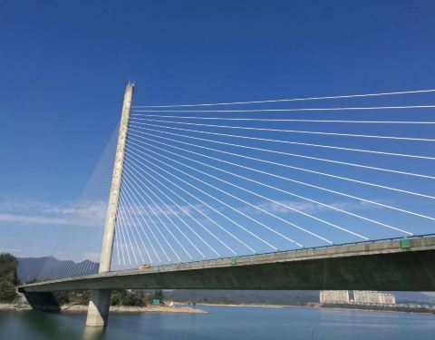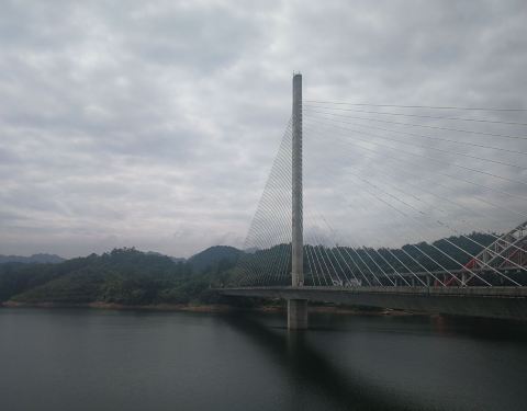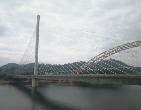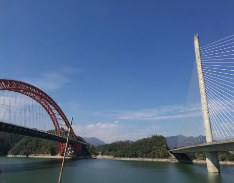 照片中的彩虹桥是高速公路桥,斜拉钢索桥是省道公路桥,双桥离的很近,从太平湖面跨过,很美丽也很壮观