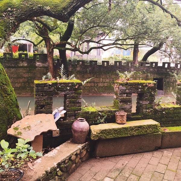 在小桥边的古城墙一方庭院,