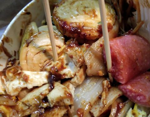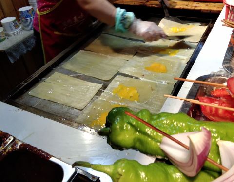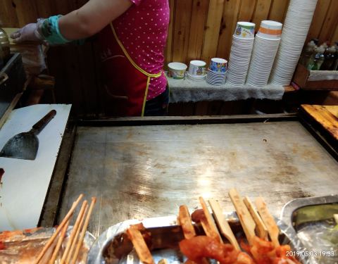 五一小长假里的台东美食项目 之前最喜欢的烤冷面,在节假日里人更多了,所以凑热闹来一个,老板娘很厉害,一锅出这么多,原来一锅做十个,现在少说十五个。 一吃,果然是只有数量没有质量,口感差,挤在一起,火大,不知道什么酱的融合,败笔
