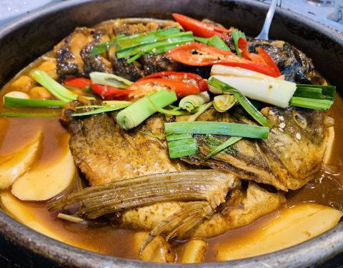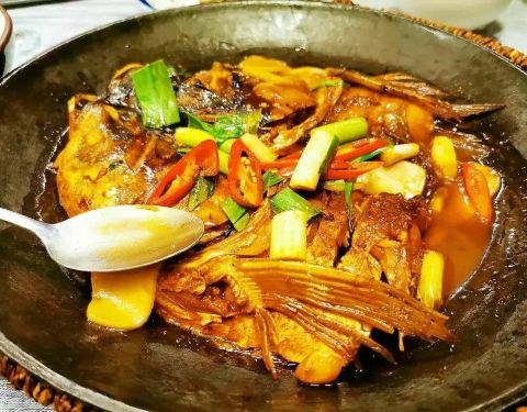 私房铁锅鱼头 我最爱的菜品没有之一,鱼头肉质厚实多汁。夹起一块蘸上一点酱汤,入口皮滑肉嫩,鲜香浓郁。 私房手工年糕 金黄的色泽好诱人呢,你一定要趁热吃哦,感受香甜在口腔中蔓延开来的感觉,令人无比满足。 如果食物只是用来解馋,那你真得不知道在饥肠辘辘那一刻遇见一份特别好吃的铁锅鱼头,一口吃进嘴里的惊喜让人欣喜。
