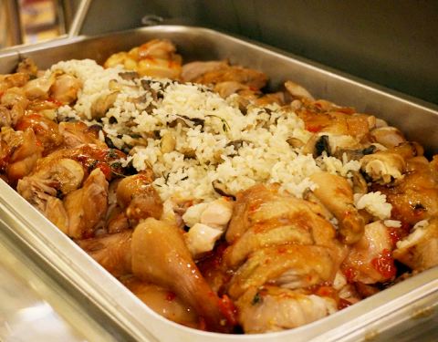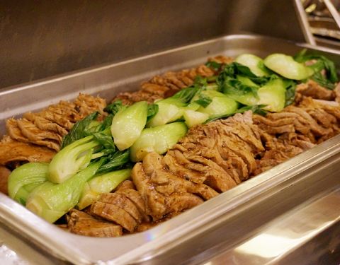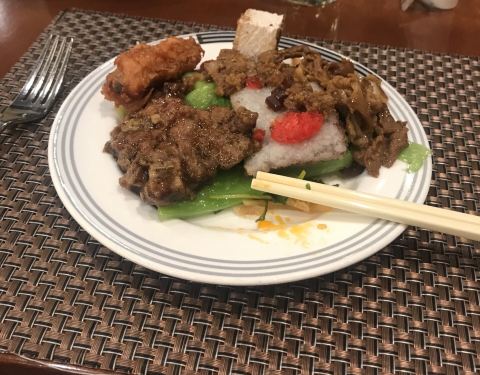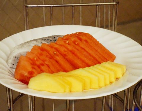在钻石会议室旁边的自助餐厅,因为这次研讨会日方来了十多位,所以菜品结合了日本人的口味,有刺身、寿司等日料,毕竟多数还是中国人,还有炒米饭、麻婆豆腐等中式料理。有醋溜拍黄瓜、地中海面条沙拉配罗勒酱汁、泰式牛肉沙拉、香菇、蘑菇沙拉、各种寿司、海鲜刺身、香草烤鸡配蘑菇小米饭、耗汁炒时蔬、扒烤牛柳配油菜及胡椒汁、麻婆豆腐、扬州炒饭等等,还有西瓜、哈密瓜、火龙果等水果,最后会上小甜品。