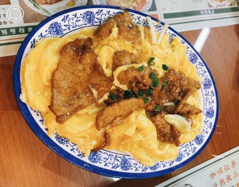 网红餐厅打卡 虾仁滑蛋饭一直都不来感因为觉得容易腻 这家虾仁滑蛋比想的还要腻难吃 东发独家漏奶华一口下去罪恶感十足 切开的时候 牛排流出来 满满的满足感!真的超级棒
