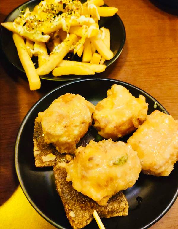 ☀️今日份・写一家宵夜时段 我在家乡👀偶遇的泡泡店吧 “泡泡”〰️即串炸 💁🏻♀️初见这家小店 装修设计风格偏向于日系 小店外头泛着的暖黄色🏮灯光 在黑夜中,很是温馨 从价位、用材、装修等来看 算是小资情调✨啦 🌼总体来说算是不错滴 奥利奥泡泡、佑酒鱼皮及泡泡の薯条 是它家的招牌呢 ▫️奥利奥饼干经过高温油炸之后,口感偏软,甜度还是很明显的,吃个1、2片解解馋不错 ▫️泡泡の薯条跟酱料的配合后,口感层次丰富起来了,还可以的 ▫️佑酒鱼皮、芥末章鱼我还蛮喜欢的 ▫️香蕉、花菜、年糕、里脊肉就是很基础的点单了,大家一般都会想着来几串吧,好吃好吃的🥳 ▫️旋风土豆则是看个人喜欢啦,哈哈身为土豆控的我还是爱的 ⏰营业时间:17:30以后 📍地址:乐清双雁路1号13-14