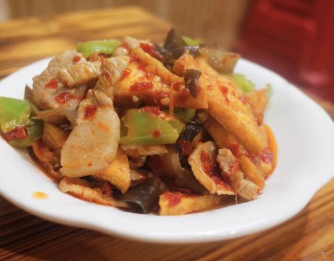 黑木耳厚实入味,青椒肉片儿也不会腻,贵州风味很足。寨子里的鸡肉也属于母鸡,肉质偏硬,好难嚼啊