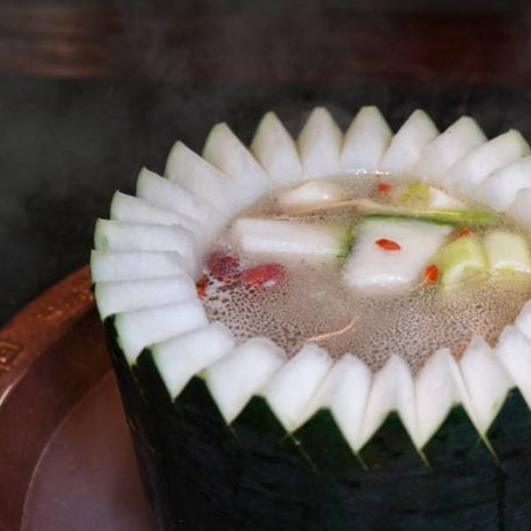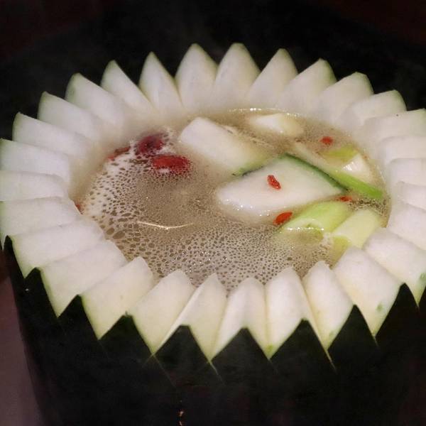 特色冬瓜锅,整个冬瓜掏空,作为锅底容器,让锅底更为的清淡爽口,清新满盈。