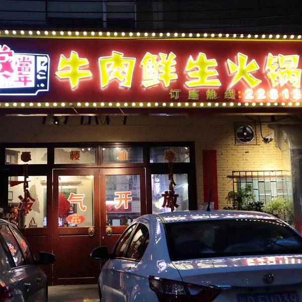 暴雨的顺德继续逛街已经不可能了,看了下顺德美食地图,找到这家赏当年牛肉鲜生火锅,谁叫下雨天和火锅最配呢? 推门进去就让我大吃一惊,贴满小广告的电线杆子还有信报箱,这些小时候的东西都被完美复制到这里...暴雨的顺德继续逛街已经不可能了,看了下顺德美食地图,找到这家赏当年牛肉鲜生火锅,谁叫下雨天和火锅最配呢? 推门进去就让我大吃一惊,贴满小广告的电线杆子还有信报箱,这些小时候的东西都被完美复制到这里,古旧的小楼、牌子甚至是二楼晾晒的衣物。把整个赏当年变成一个小街坊,而我们就像在露天的广场吃饭一样,非常怀旧。当然,也不是真的露天拉,而且有空调的。 条凳和方桌也和怀旧气息十分搭调,落座之后,服务员送来茶水,且都很有礼貌。 来这家店就是为了点传说中的「冬瓜盅汤底」,以镂空的冬瓜为容器放入盆中,中间投入薏仁、豆以及香料和药材,再倒入高汤,整个汤头清甜且带有淡淡的香味。 牛肉是他们店招牌,自然要来一点。要了「肥胼」「肥牛」和「牛百叶」,顺便要了一碟青菜。店家在每样肉品上都贴了黄色小旗子,标注了汆烫时间,照着来就行了。 肥膑肥瘦相间,瘦的嫩滑,肥的爽口,同时两种口感在味蕾中交替升华。肥牛切薄片,稍微汆下出锅,鲜嫩无比,而百叶则十分Q弹,富有嚼劲。值得一提的是吃完全部肉品,冬瓜内壁的肉也熟了,服务员会过来切冬瓜,此时的瓜肉松软入味,特别好吃。 赏当年门口停车位还蛮紧张的,可以停到临近街道中再步行一小段。 赏当年牛肉鲜生火锅店 同兴路与环市南路交叉口西70米