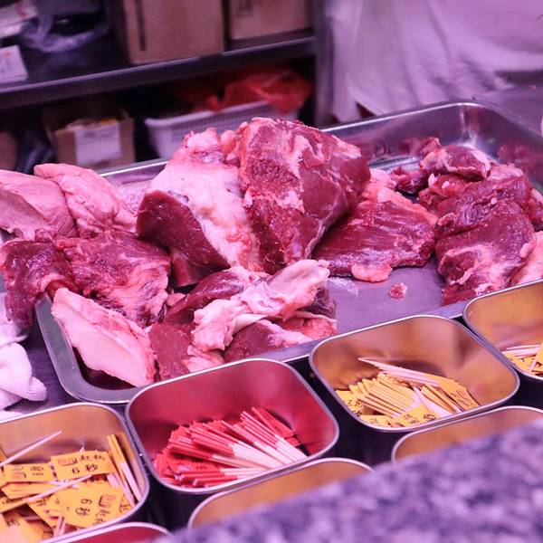 透过“华盖市场牛肉档”前的玻璃橱窗,可以看到年轻的厨师们个个刀工精湛,熟练地大刀细切着厚重案板上的大块牛肉,每一道流程专业、透明、细致。牛肉被精选细分后变身一盘盘切好码齐了的肥瘦肉片。进店必点:凉拌鱼皮(23元)