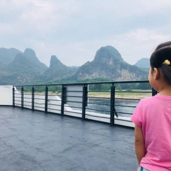 如果带老人小孩出行,可以是首选。虽然全程四个多小时,但是前面俩小时在甲板上欣赏沿途风光,到中午了吃自助午餐,再休息一个小时,就到了。因为风景美,舱内又很整洁,游客也不多,所以给人很舒服的感觉。漓江...