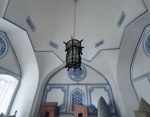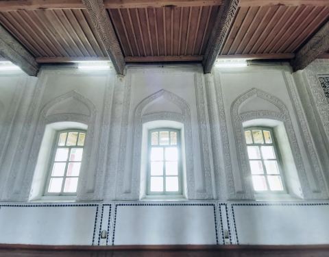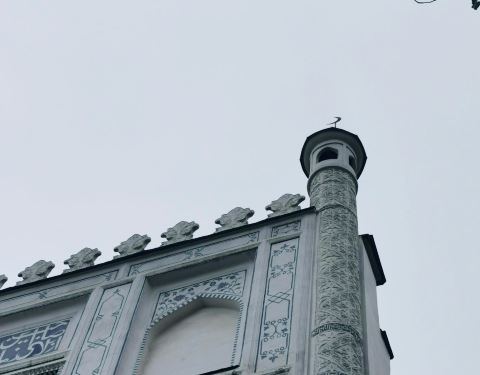 始建于1895年,由中国建筑师鸿峰设计建造,坐落在阿拉木图的扎尔肯特镇 Zharkent Town。大殿“浮顶”的四个飞檐向上弯曲,末端上装饰有代表清真寺的星月标志。进入主殿,清真寺的宽敞感就十分明显了,放眼望去,容纳千人应该绰绰有余。没有传统中国寺庙的佛像、供台、蒲团等等,所以是清真寺加入了中国建筑元素。两侧墙体上各整齐开有一排窗户,窗框朝外侧为中式,内侧为清真寺风格,并配有装饰雕刻花纹。