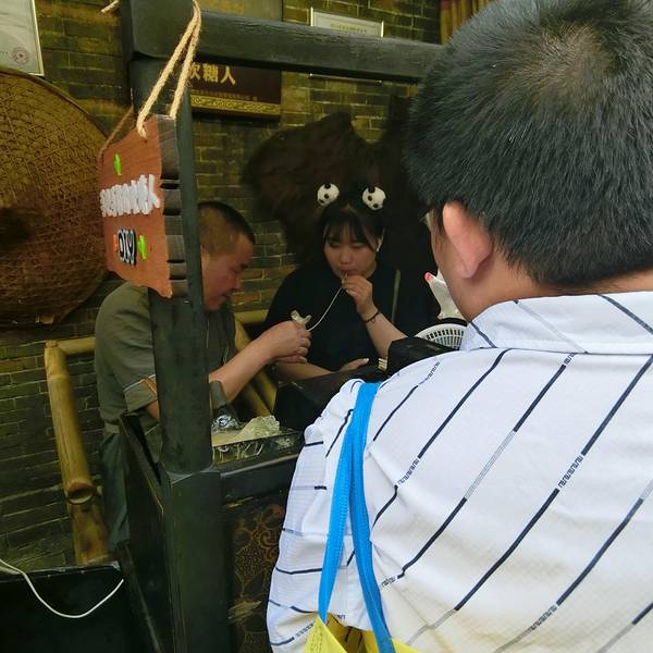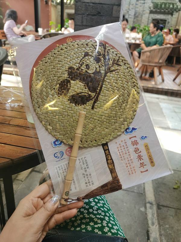先前的导游说去过宽窄巷子就不用到锦里了,都差不多,我觉得还是有点区别的,锦里看起来更像我们一般见到的各个古镇,只是小吃更有当地特色,再多几家蜀绣店或者掏耳朵的地方。说实话,蜀绣确实很漂亮,就是太贵,一个扇面好几百,我还是买个藤编的小扇子回家去哄我妈妈吧!