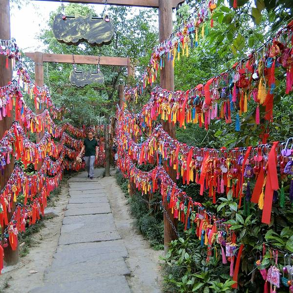 锦里与武侯祠一墙之隔。人们一般都会在游玩好武侯祠后,来锦里逛一逛。锦里洋溢着成都市井特有的喧嚣和随意。街道两边售卖的都是颇具当地特色的物品,手工的皮包、五颜六色的布灯笼等,还有众多老成都手艺人在忙碌,吹糖画、捏面人。此外,各色美食绝对令你垂涎三尺,张飞牛肉、豆花、牛肉焦饼、钵钵鸡,各具风味。