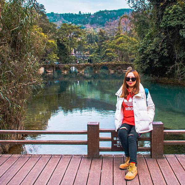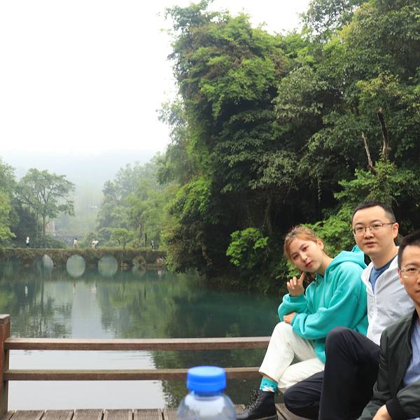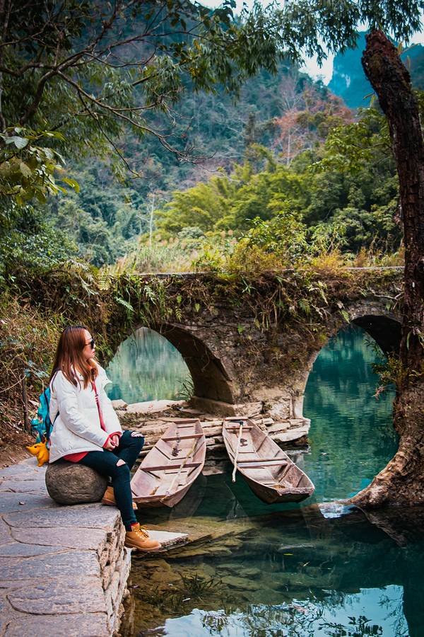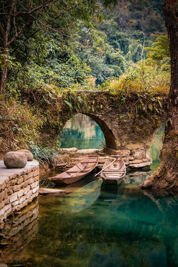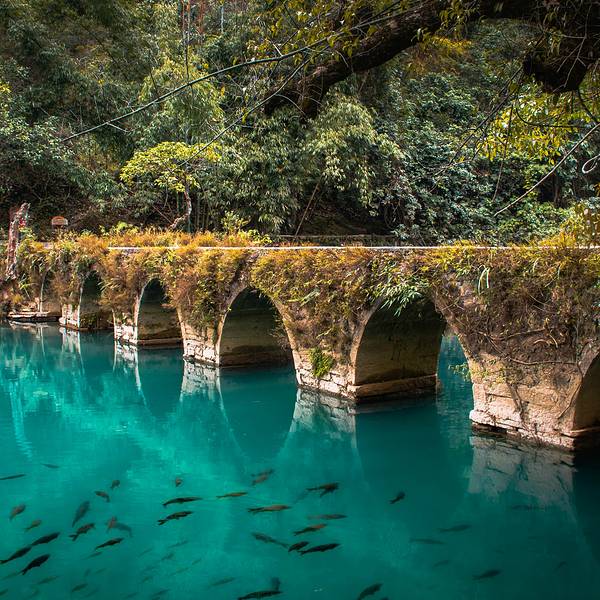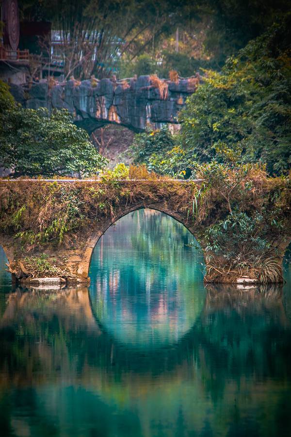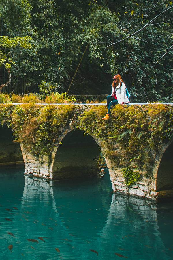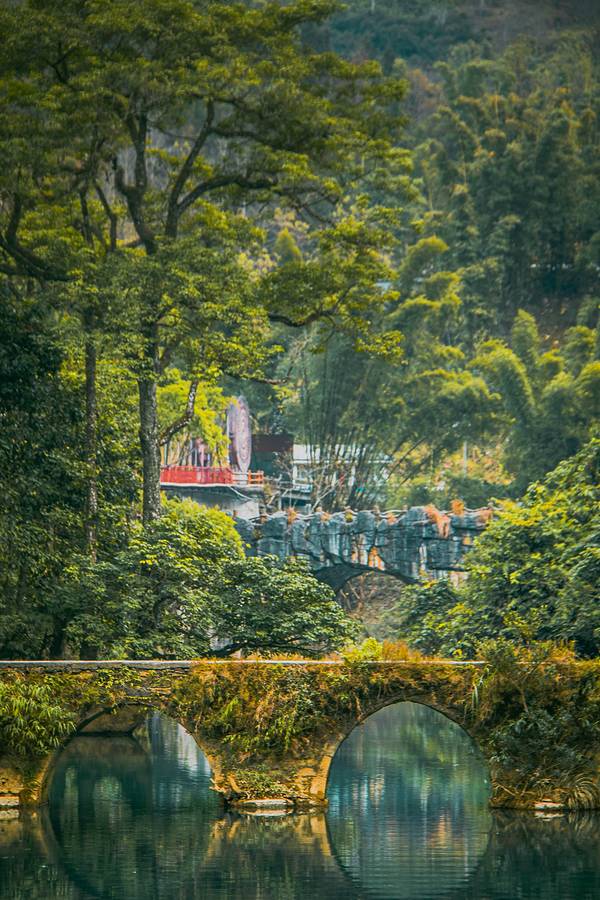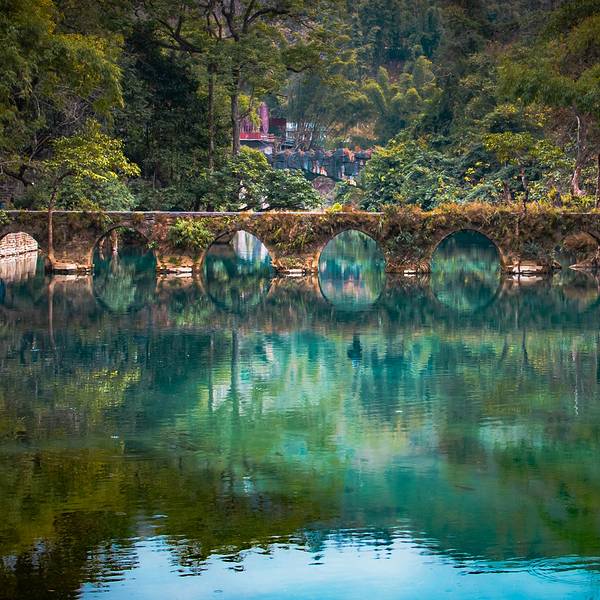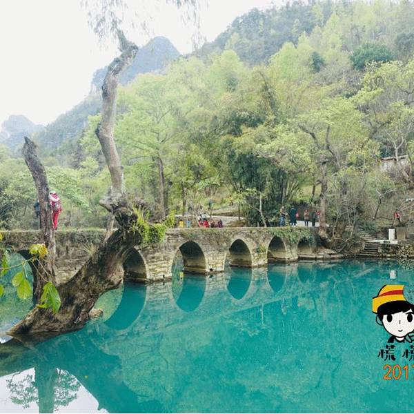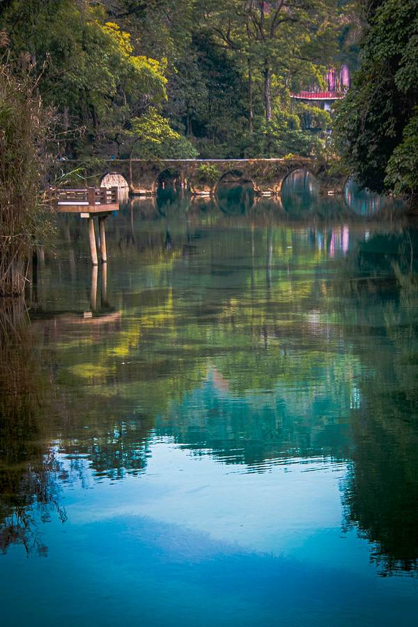 这是一座小巧玲珑的七孔古石桥,桥长25米,桥面宽4米,拱高4米,建于 清道 光十五年(1836年),昔日为沟通 荔波 至 广西 的重要桥梁。桥由麻石条砌成,桥身爬满藤蔓和蕨类,古色古香的桥下是绿得令人心醉的涵碧潭。还有肥的让人流口水的大鲤鱼,每条最少20斤淡季的好处大概就是下图,有点耐心,等到16点之后,能拍到几乎没人的桥