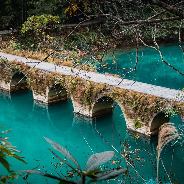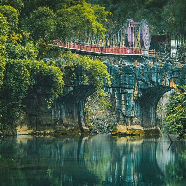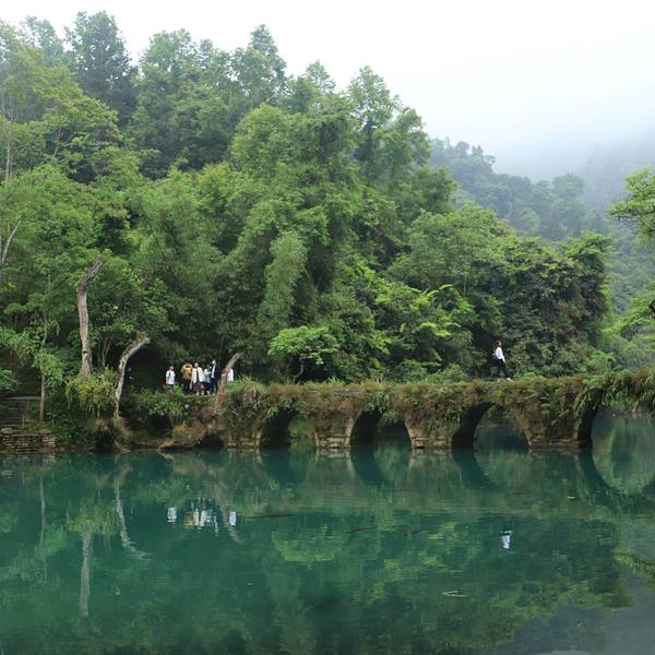 这是一座小巧玲珑的七孔古石桥,桥长25米,桥面宽4米,拱高4米,建于 清道 光十五年(1836年),昔日为沟通 荔波 至 广西 的重要桥梁。桥由麻石条砌成,桥身爬满藤蔓和蕨类,古色古香的桥下是...景区之名由桥而得。